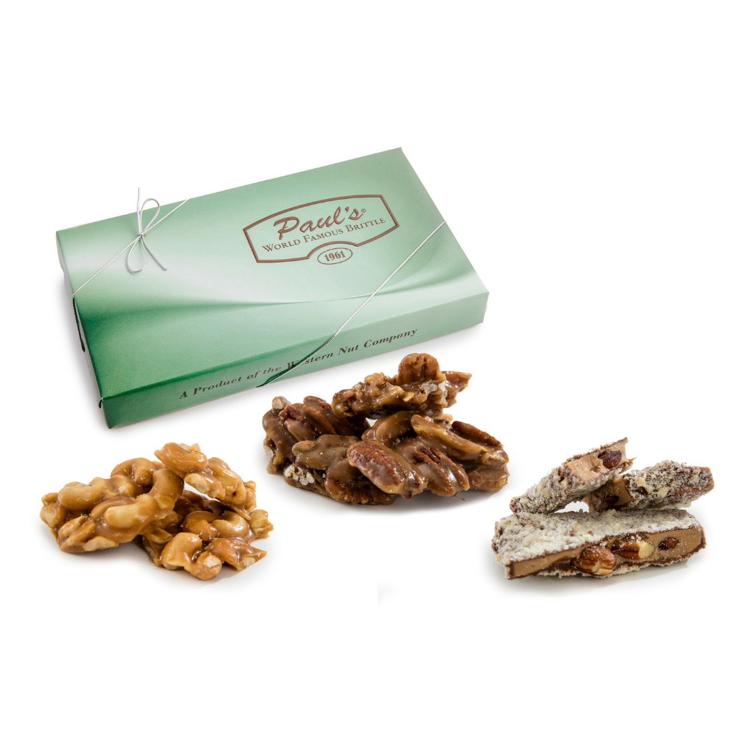 Brittle & English Toffee? Yes, please! Pecan Brittle for the tradition; Cashew Brittle for a sweet softer crunch; and English Toffee to melt in your mouth!