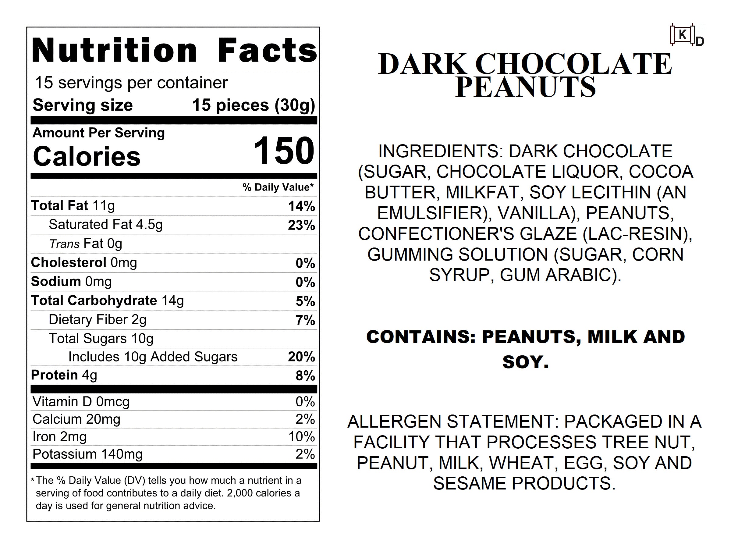 Smooth, delicious, dark chocolate panned peanuts. A tantalizing mix of protein from the peanuts with bittersweet dark chocolate to satisfy your taste buds.